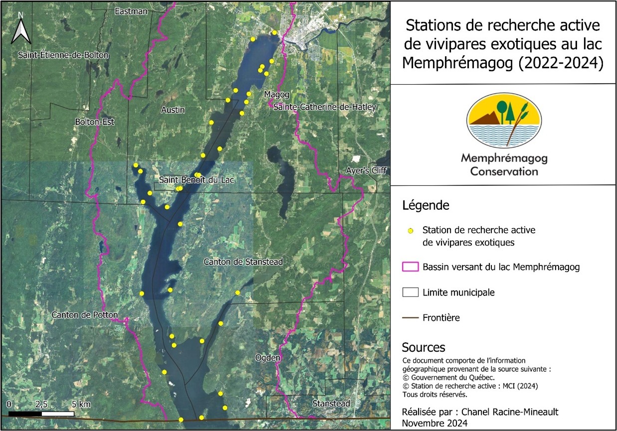Stations de recherche active de vivipares exotiques envahissantes au lac Memphrémagog, de 2022 à 2024.